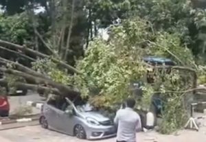 Akibat peristiwa itu, sebuah mobil Honda Brio dan lampu penerang jalan umum (PJU) tertimpa pohon tumbang.